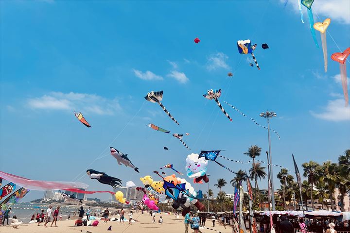 会場となるのは、パタヤ中心部に位置するパタヤ・ビーチ。イベント期間中、広い空いっぱいに色鮮やかなカイト(凧)が舞い上がり、まるで巨大なアートギャラリーのような光景が広がります。